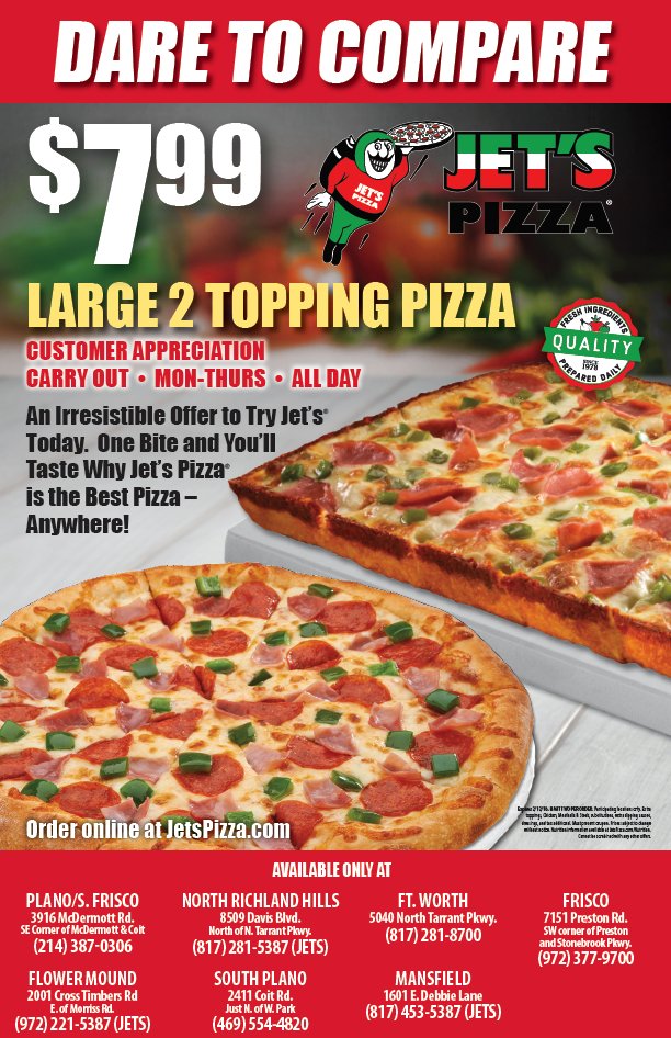 Jets Pizza Dfw On Twitter Dare To Compare And Taste For Yourself Why Jets Pizza Is The Best Around Enjoy A Large 2 Topping Pizza For Just 799 Valid All Day Monday